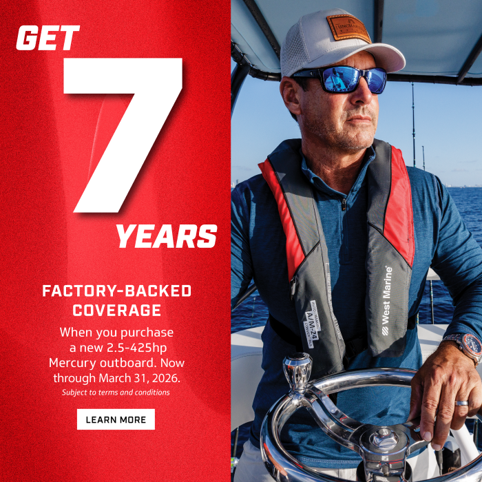 Now through March 31, performance meets peace of mind when you buy a new 2.5 – 425hp Mercury outboard as part of a new boat package or to repower your current boat. That’s the standard 3-year limited warranty plus an additional 4 years of factory-backed Mercury Product Protection Gold coverage (a value of up to $8,330 per engine), for a total of 7 years of coverage.